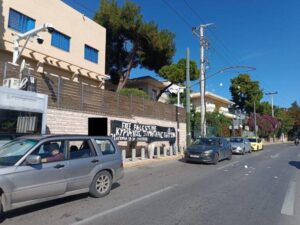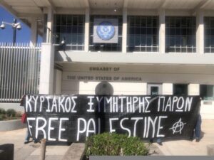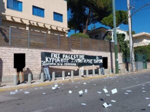 L’« Assemblée de solidarité pour les combattant-es emprisonné-es, en fuite et persécuté-es » a organisé aujourd’hui, samedi 25 octobre, une intervention avec des banderoles et des tracts devant les ambassades d’Israël et des États-Unis [à Athènes]. Les compagnon-nes qui se sont rendu-es à l’ambassade d’Israël ont été arrêté-es et sont désormais libres.