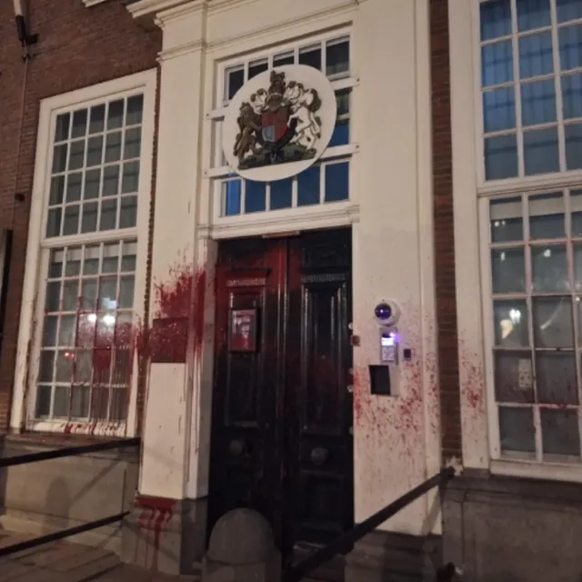 Le 23 décembre à la Hague (Pays-Bas), l’ambassade britannique a été recouverte de peinture rouge en solidarité avec la grève de la faim des prisonnier-es pour la Palestine. [Palestine Action NL]