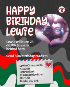 Le 8 janvier marquera l’anniversaire de Lewie, qui aura ses 23 ans toujours emprisonné et probablement encore en grève de la faim. Il est possible de lui envoyer des cartes postales, des dessins et des lettres, à condition de laisser une marge importante. Pour lui envoyer des lettres d’anniversaire, son adresse est la suivante :